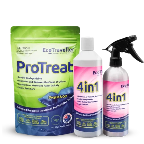 Are you looking for an Australian made and owned alternative to treat your portable toilet? Look no further than the EcoTraveller Portable Toilet Starter Bundle. ProTreat is Designed for use with both 1s and 2s and regular house hold toilet paper. Not recommended for use with 1s only.