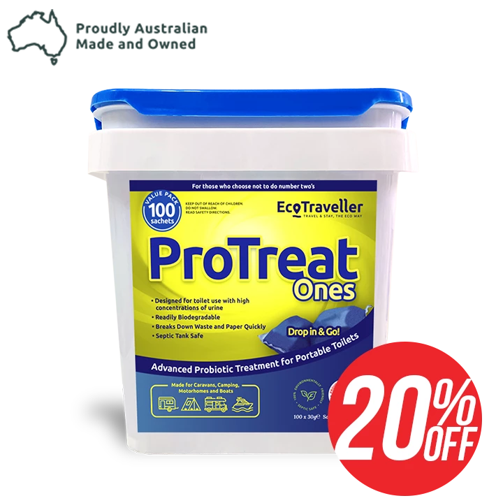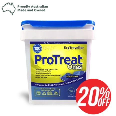 Specially formulated for those who use their toilets for 1’s only or for a higher ratio of 1’s to 2’s. ProTreat Ones is designed to deal with 1s as the main food source for the active probiotics. ProTreat Ones will still work with mixed waste but will suit those who don’t like to use their portable toilet for everything. ProTreat Ones provides you the ability to effectively service your portable toilet, whilst ensuring the environment is protected in the process. Offering you the ease of use in convenient pre-packaged water soluble satchels, that ensures no clogging of pipes, pumps or valves. Australian made and owned! Look no further than the EcoTraveller ProTreat ONES 100 Pack