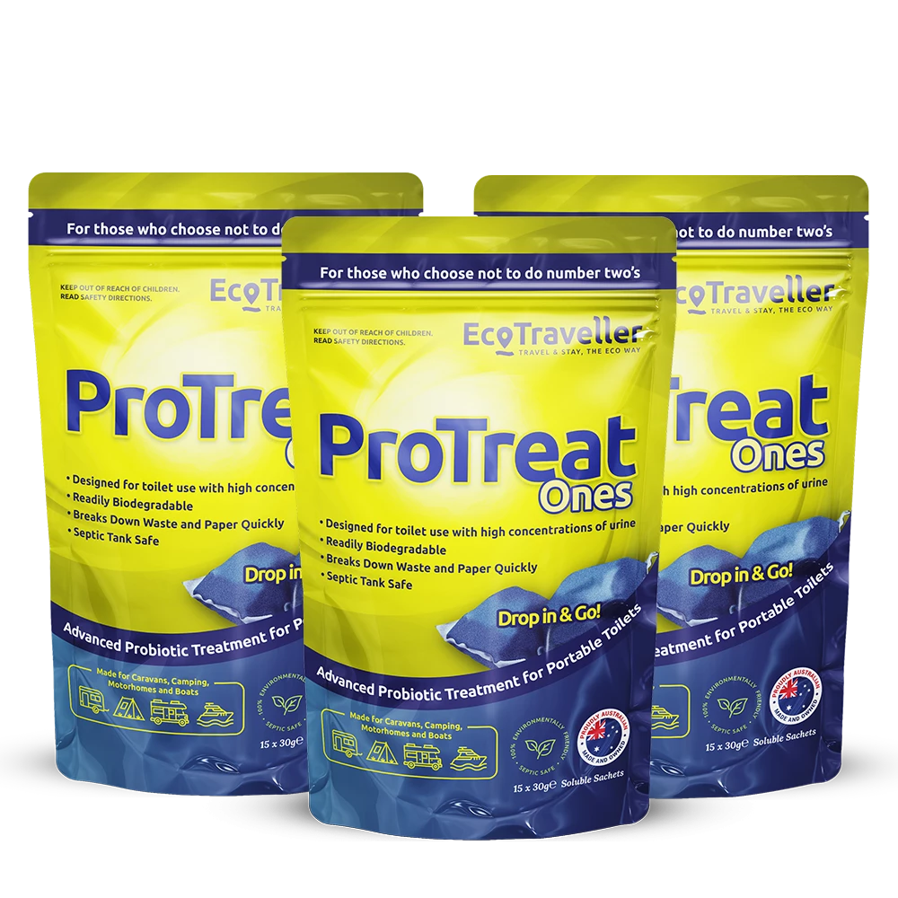 Are you using your caravan toilet for predominantly urine only? EcoTraveller has formulated the ideal combination of probiotics and enzymes to treat high concentrations of urine in your caravan, RV and motorhome toilets. Protreat Ones provides you the ability to effectively service your portable toilet, whilst ensuring the environment is protected in the process. Offering you the ease of use in convenient pre-packaged water soluble satchels, that ensures no clogging and ultimate odour control. Australian made and owned! Look no further than the EcoTraveller ProTreat ONES Refill (3 Pack).