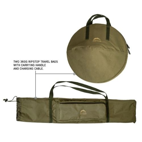 - Two 360g Ripstop Travel Bags with Carrying Handle and Charging Cable